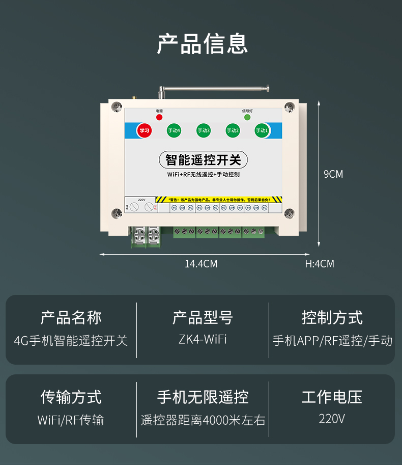 ZK4-WIFI是一款4路智能遥控开关,可使用手机进行远程遥控,不限距离。